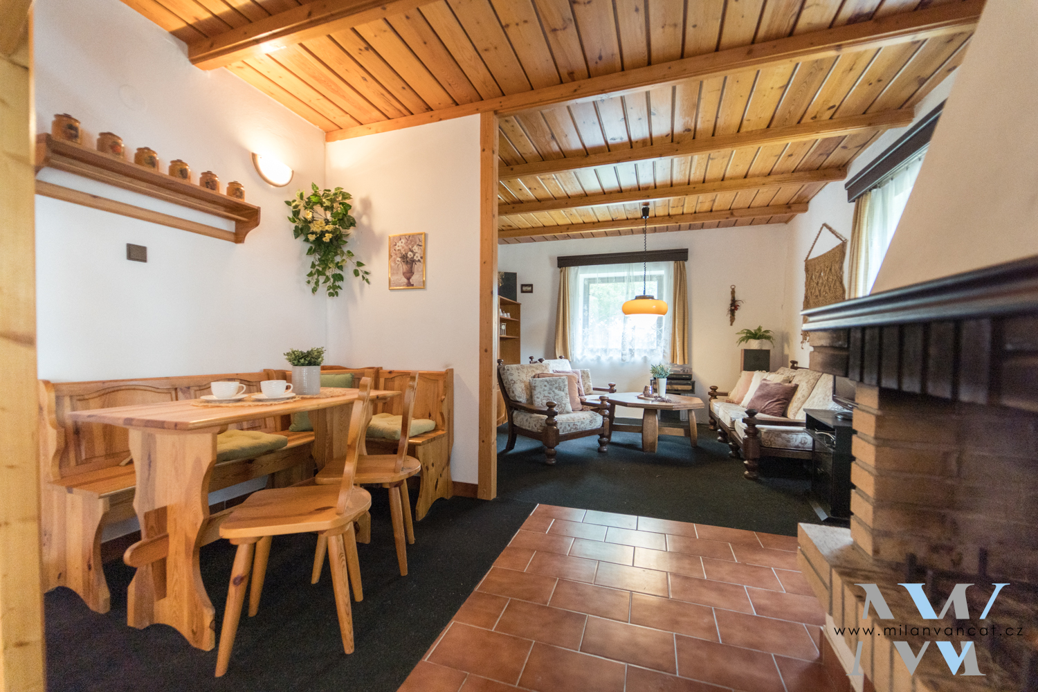 Útulný obývák v přízemí domku se pyšní velkým krbem, který spolehlivě vytopí celou nemovitost. Myslím, že posezení s rodinou zde budete milovat.