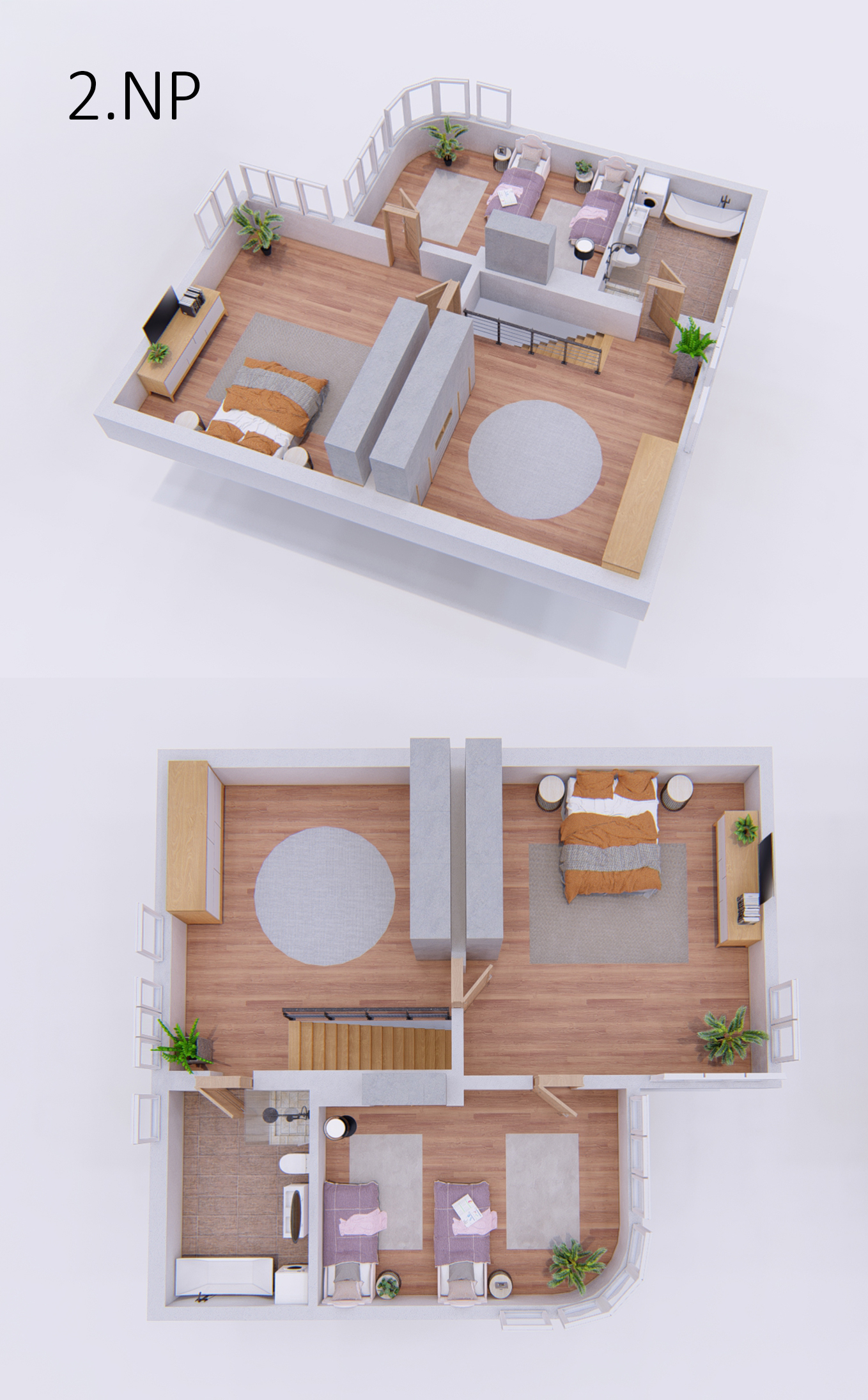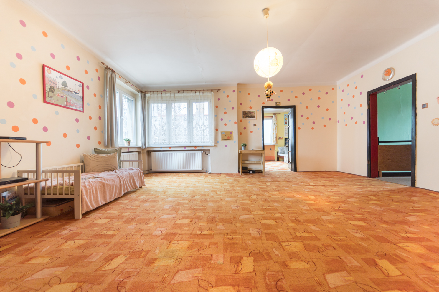 V horním patře jsou pak 3 pokoje, z nichž 2 jsou průchozí a jeden, poslední je neprůchozí.