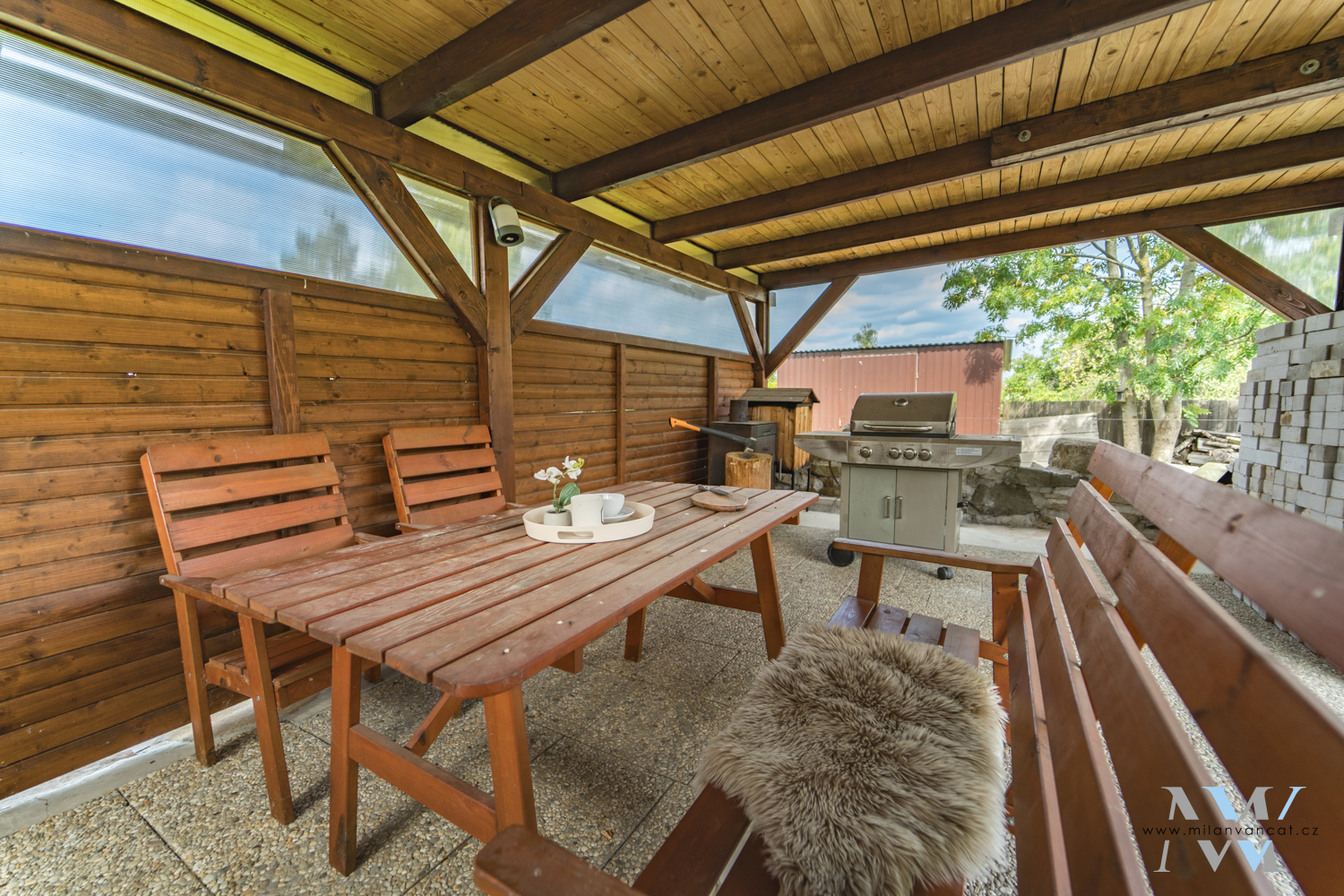 Na zahradě se nachází bazén se zděnými základy, skleník a pergola s grilem, která je skvělým útočištěm v letních měsících.