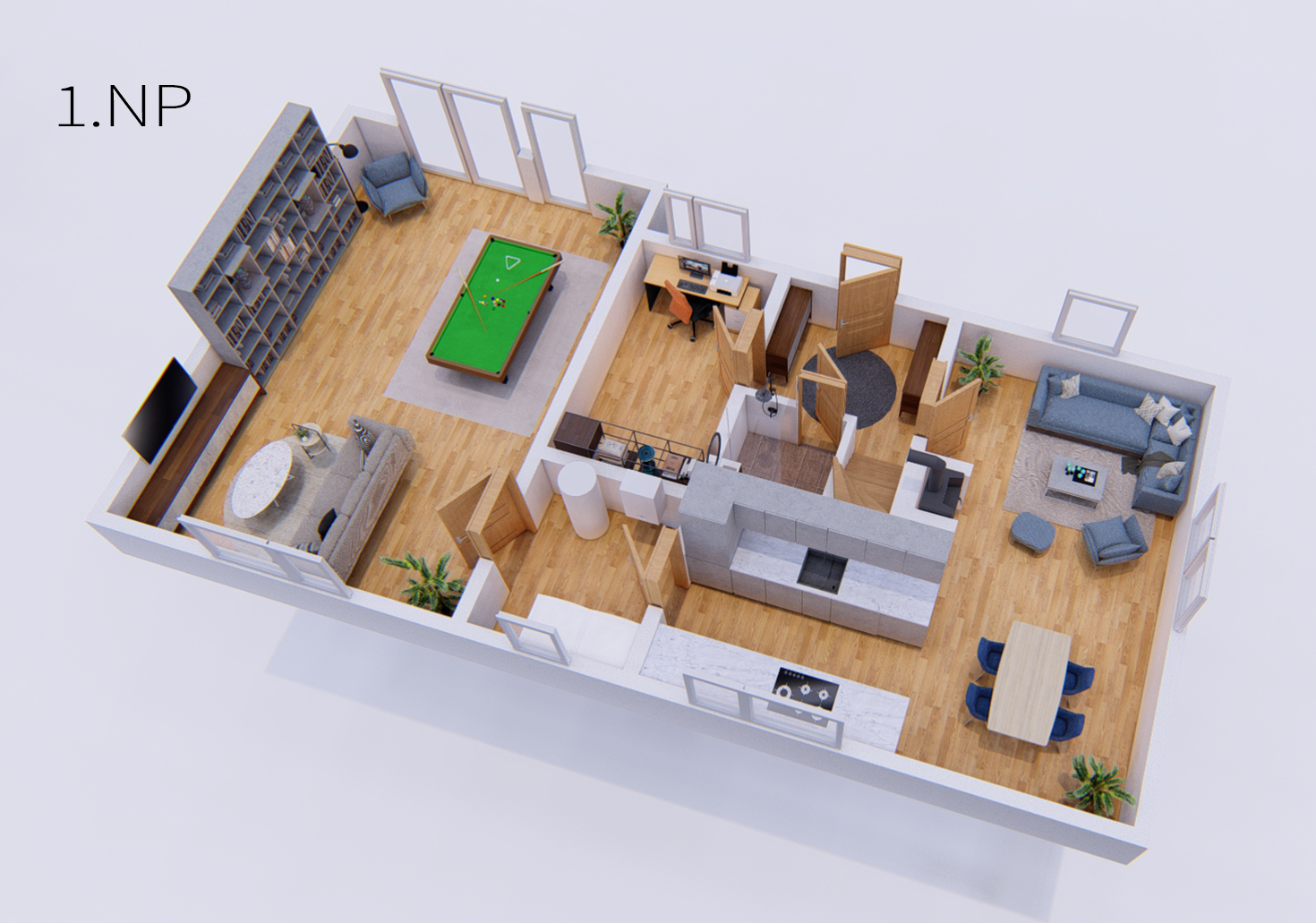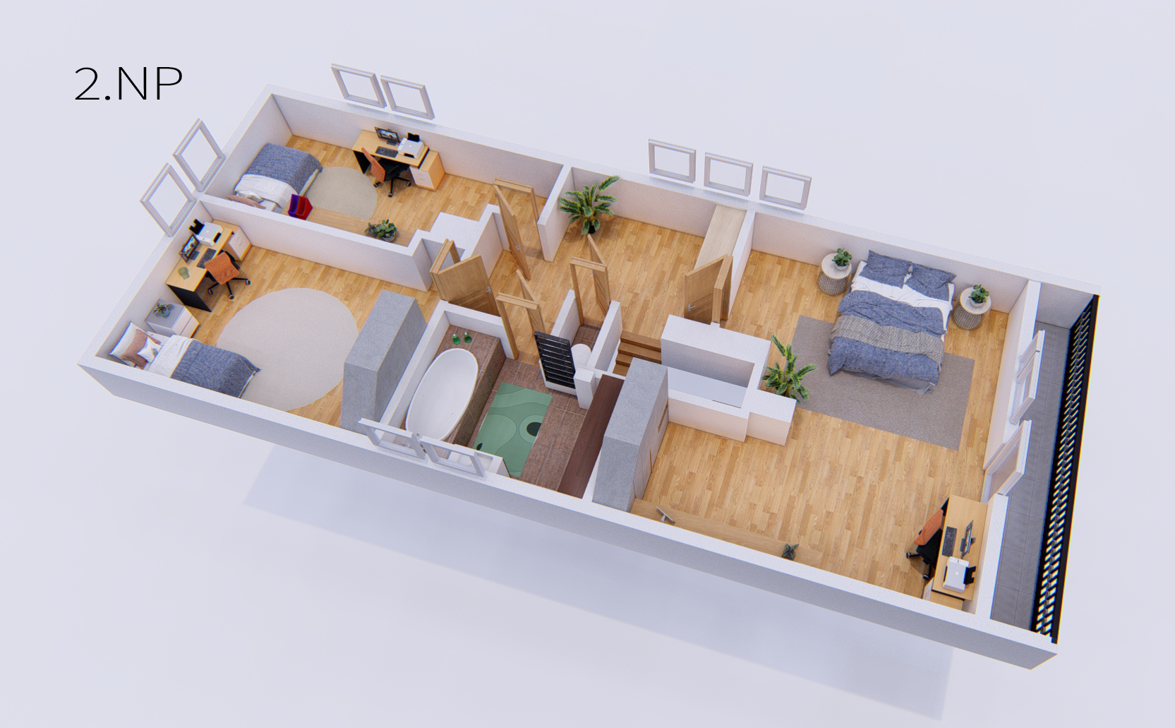 Při větších návštěvách oceníte společenskou místnost, která má vlastní vstup o velikosti více než 40m2. Spodní patro má vlastní toaletu, horní patro má opět vlastní toaletu a koupelnu. Rozložení místností pak uvidíte v půdorysu ve fotografiích.