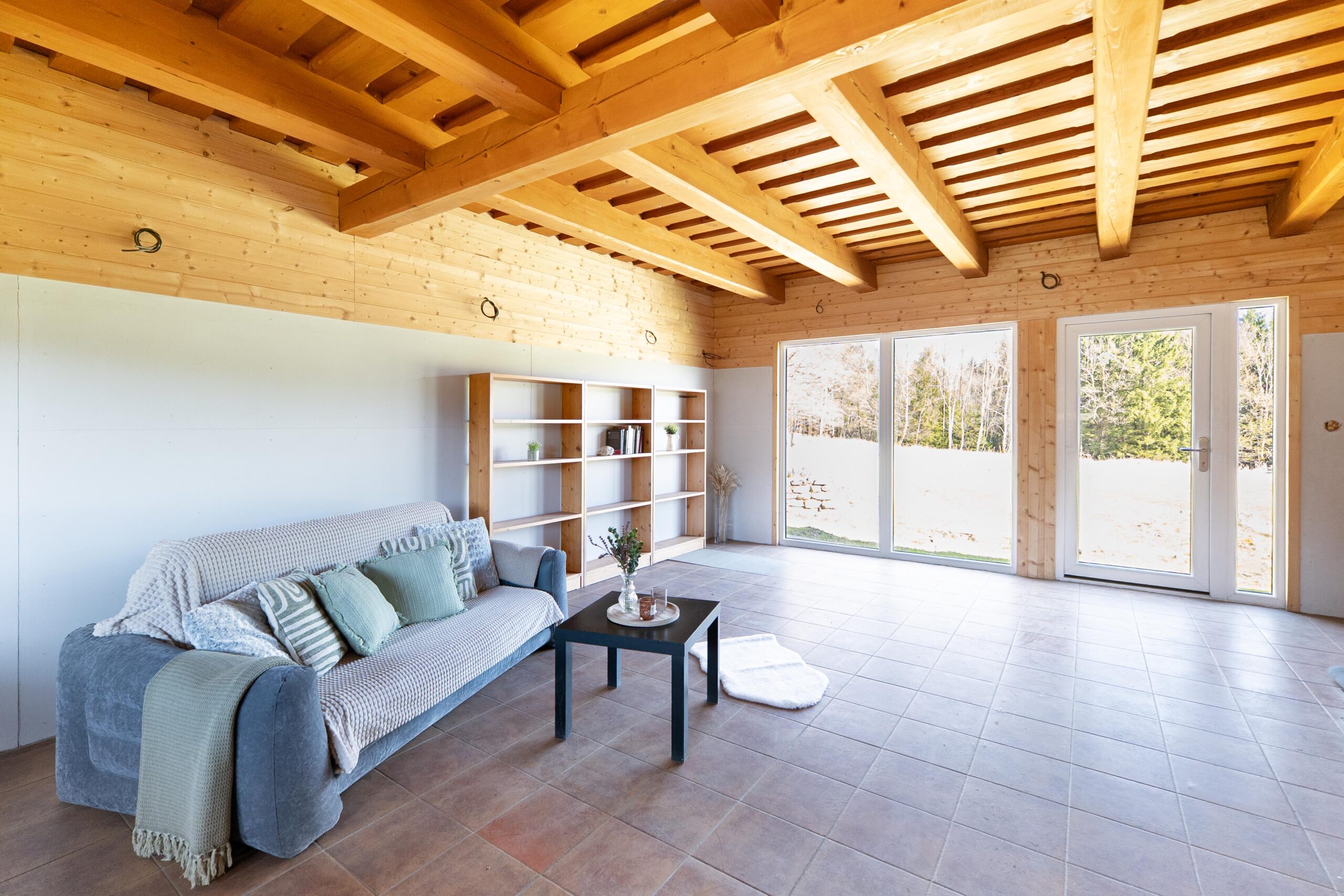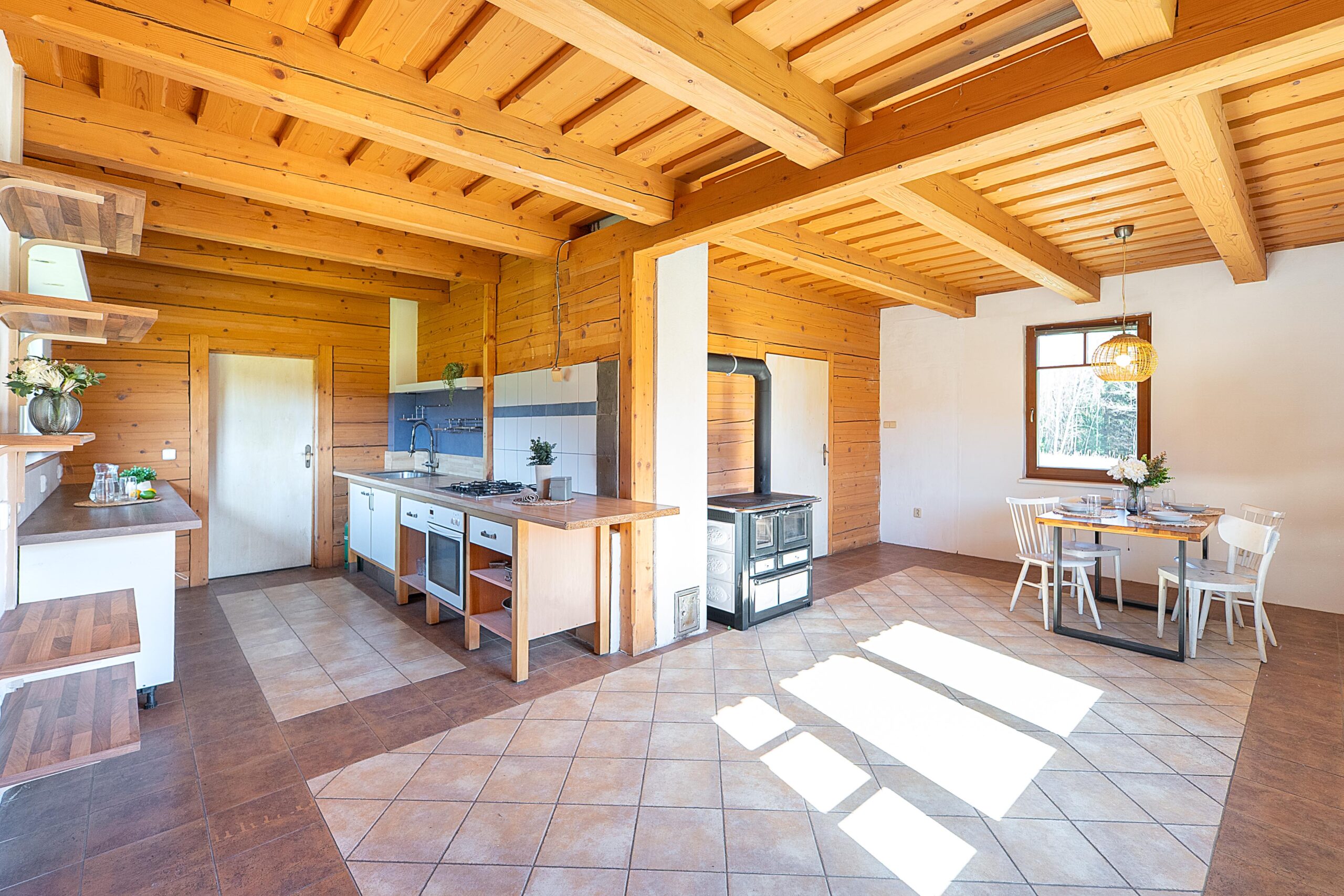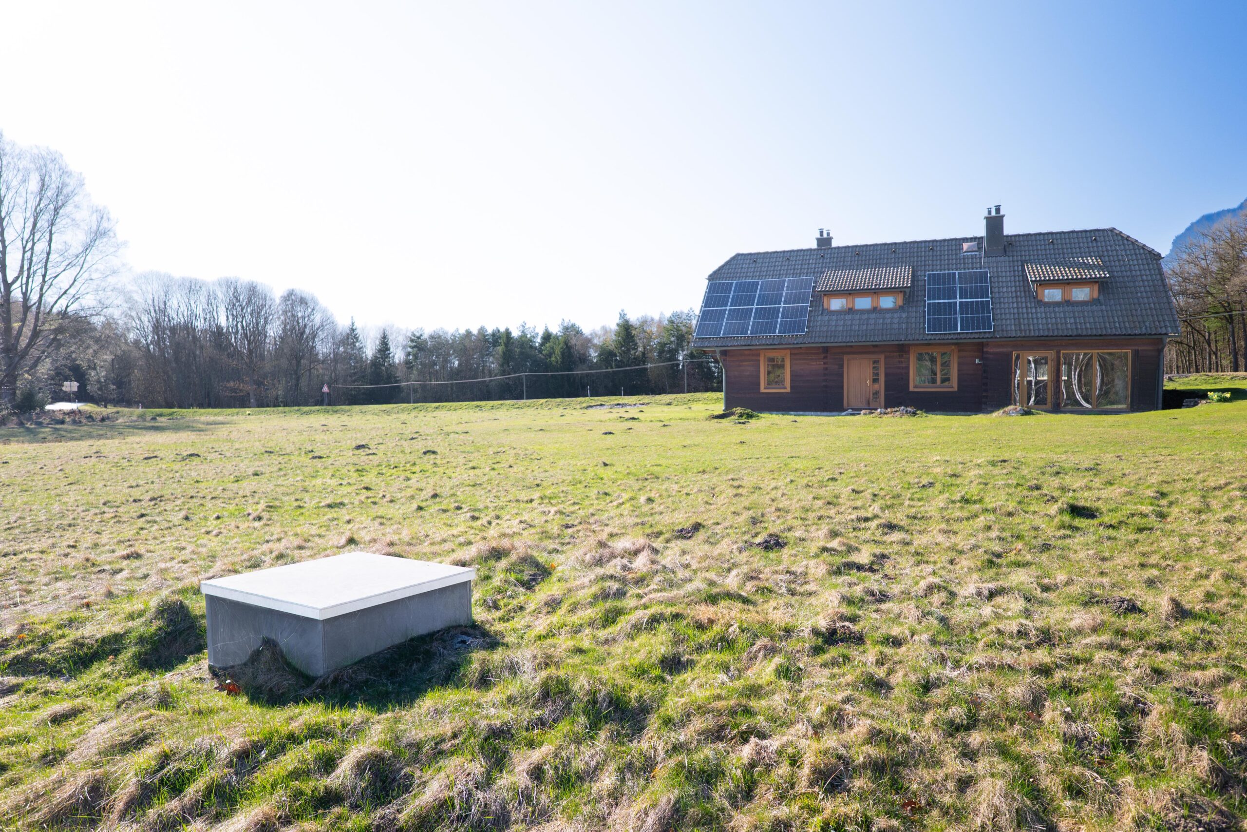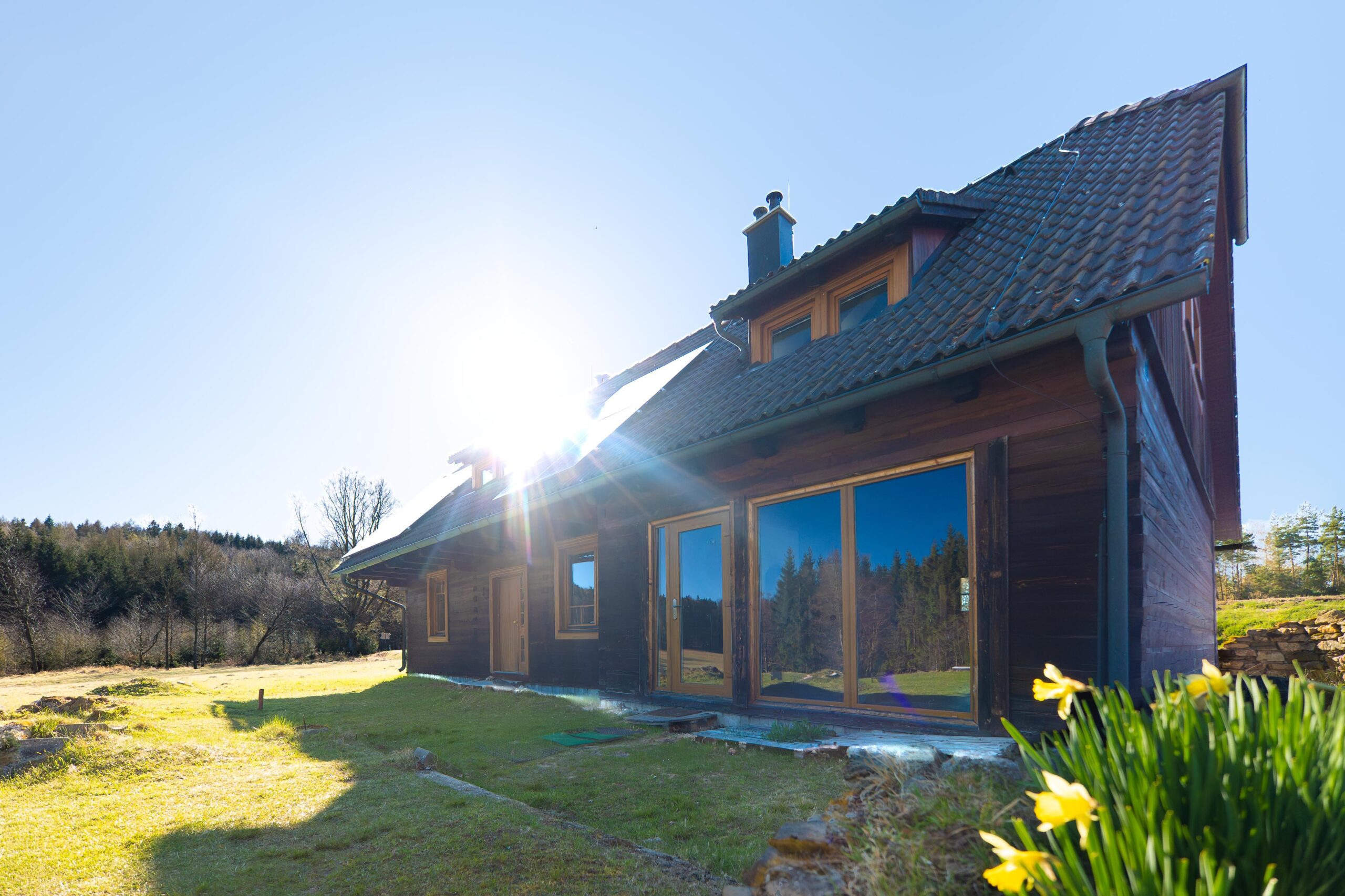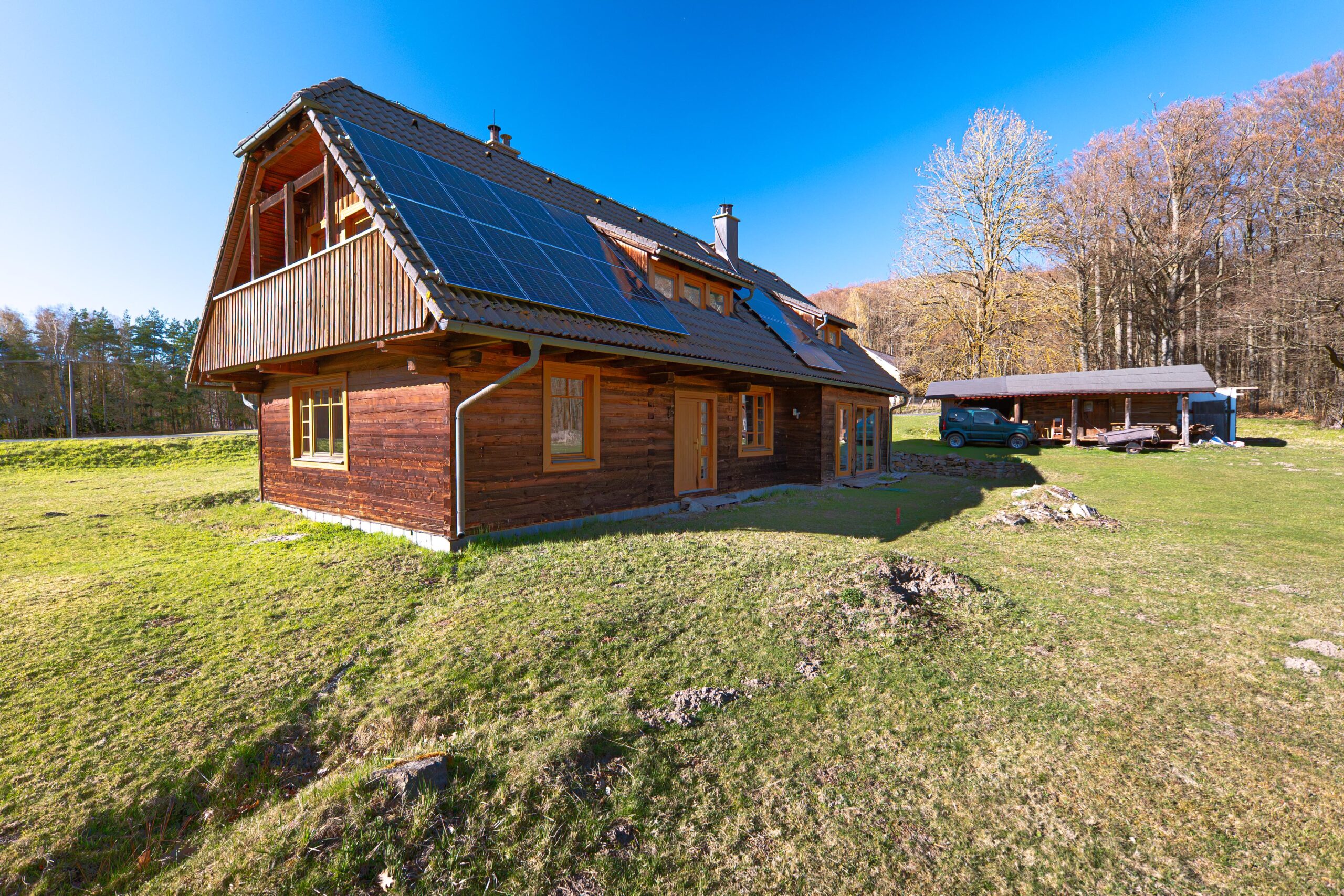 Rodinný dům, který zde stojí, je vytápěn kotlem na tuhá paliva s objemnou akumulační nádrží, na střeše má pak fotovoltaickou elektrárnu o výkonu 5,4 kWh a baterií s kapacitou 10 kWh. Voda je, jak jsem zmínil, ze svého vrtu na pozemku a odpady jsou řešeny ČOV. Jedná se o útulný dům s dechberoucím výhledem dolů z kopce, kde bonusem je balkón v ložnici směřující na lesy a louky, kde každý den můžete vidět prohánět se lesní zvěř. Nádherný pohled.